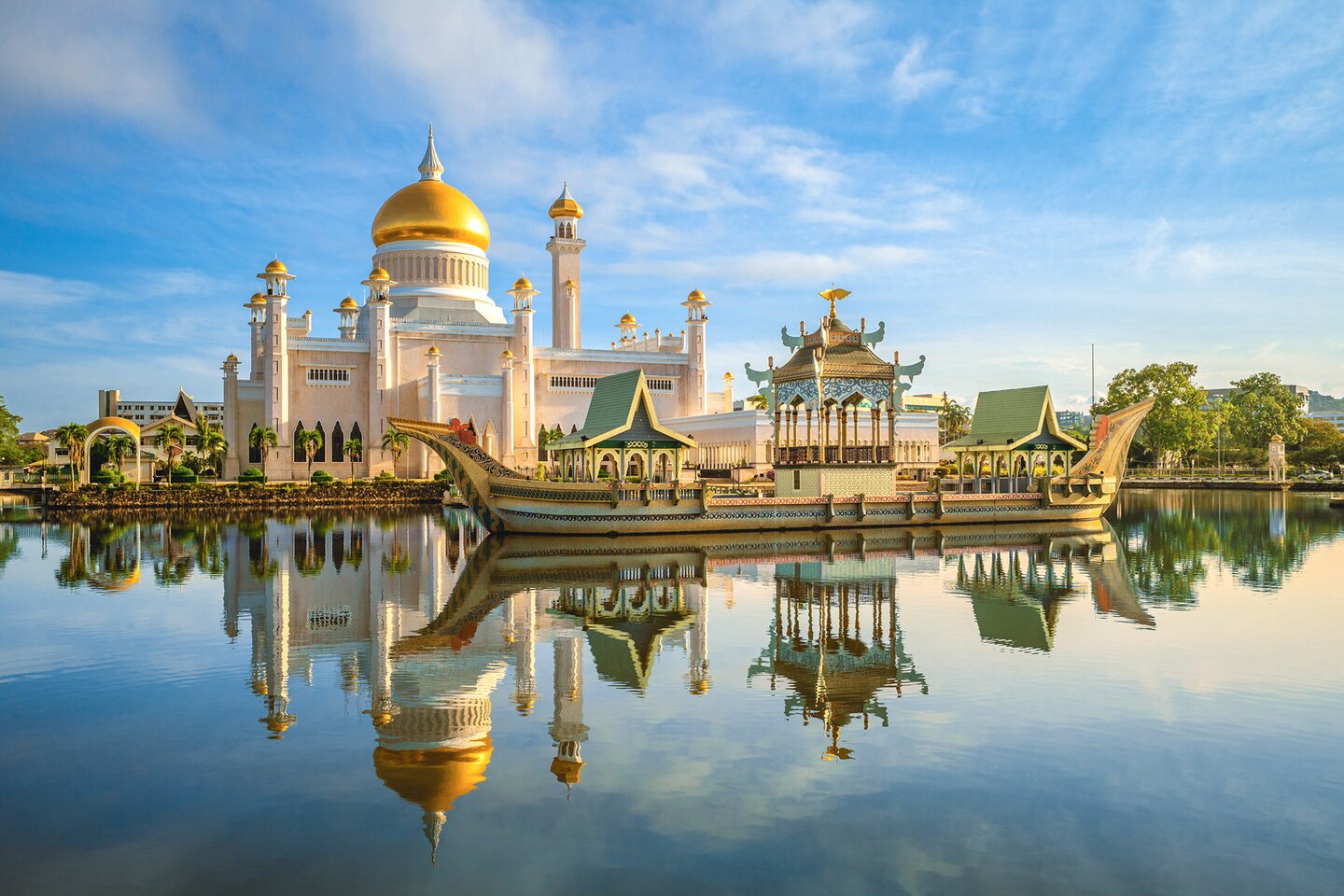 Brunei, a small sultanate full of splendour and nature, lies between the Malaysian cities of Kota Kinabalu and Bintulu. In Bandar Seri Begawan, the Sultan resides in Istana Nurul Iman, the largest palace in the world; its marble, gold and precious woods bear witness to the country’s wealth. Just a few steps away stands the magnificent Omar Ali Saifuddien Mosque with its golden dome and reflecting moat. Old Brunei awaits you across the river in Kampong Ayer, a charming stilt village with colourful wooden houses lining the wide river. Away from the city, Ulu Temburong National Park beckons with its nature: dense rainforests, exotic animals and hidden waterfalls make it an unforgettable natural paradise that lets you experience Brunei’s wild beauty.