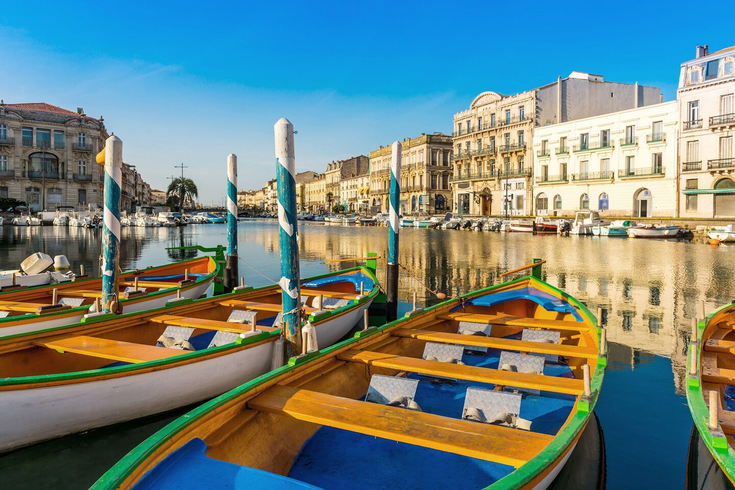 The charming town of Sete is often referred to as the “Venice of Languedoc” because of its numerous canals that wind their way picturesquely through the town. Fishing boats and sailing yachts lie side by side in the idyllic harbour, and in the small restaurants in the harbour you can sample freshly caught fish and the famous squid speciality, Tielle Setoise. Mont Saint-Clair is also worth a climb: from its platform, you can enjoy a spectacular panoramic view over the city’s rooftops, the sea and the lagoon landscape.
