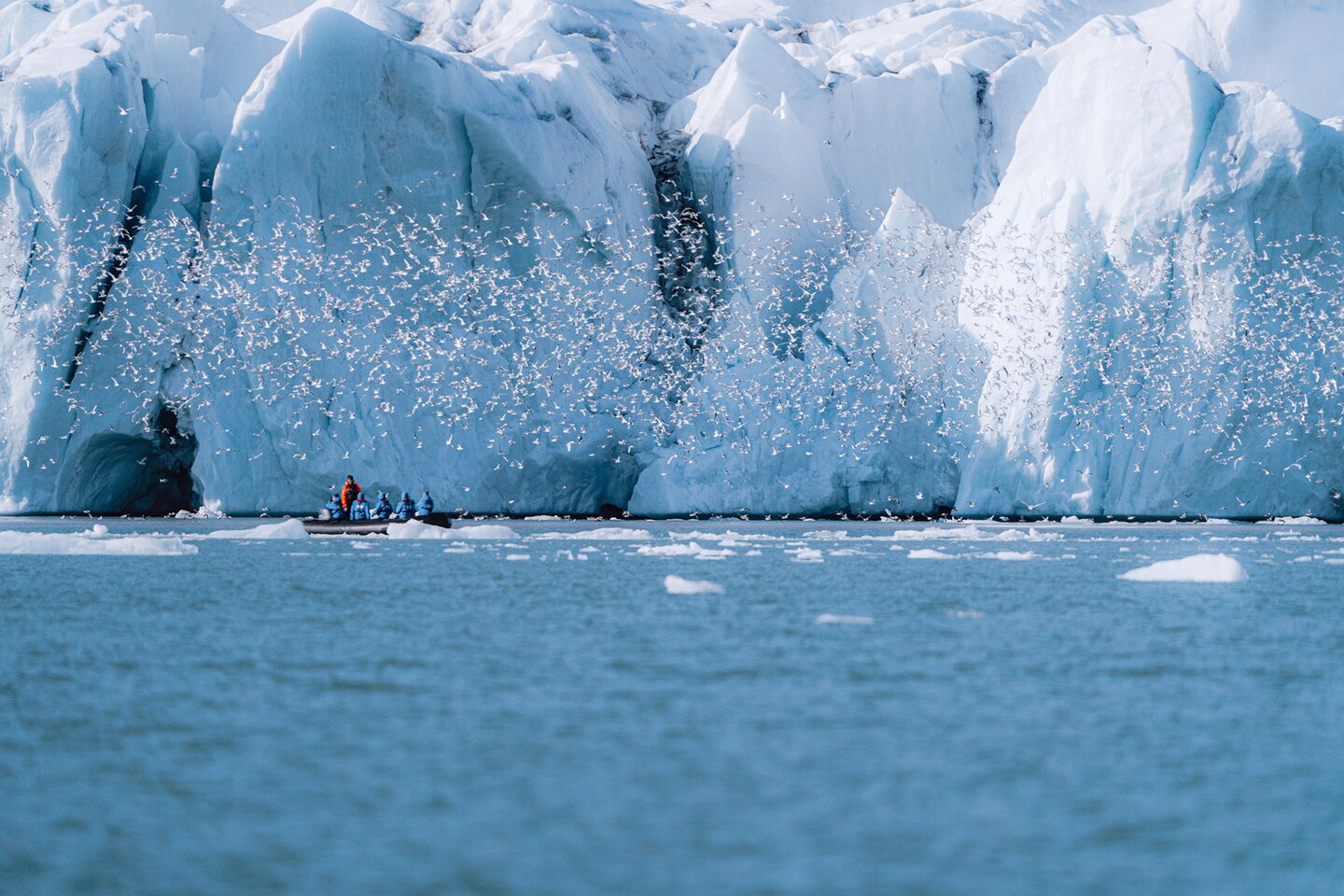 The captain and officers will constantly look for impressive scenes such as the cliffs of Alkefjellet: the “bird mountain” is inhabited by thousands of birds from numerous species, including thick-billed murres, kittiwakes, glaucous gulls, Arctic terns and eider ducks.