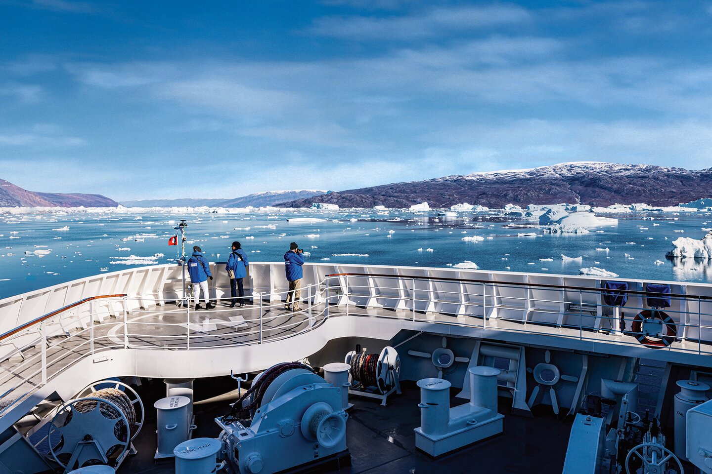 The ice-dependent passage through Prince Christian Sound – one of the most beautiful passages in Greenland, 64 km (40 mi.) long and in some places barely 500 m (1,640 ft) wide – offers an intoxicating monumental view of nature. Waterfalls and glaciers that reach into the turquoise-coloured water, as well as colourful fishing huts, will pass by you. A cry of “Whale up ahead!” could sound from the bridge at any time, and the many open deck areas provide the best opportunities for sightings.
