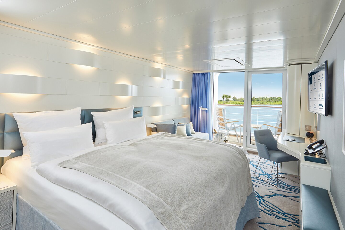 The French Balcony Cabins in Category 3 on Deck 6 are approximately 23 m²/248 ft² in size, and those in Category 5 on Deck 7 approximately 21 m²/226 ft². The Balcony Cabins at the stern have a slightly different floor plan.